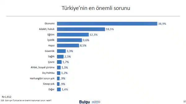 Katılımcıların yüzde 38,9’u, Türkiye’nin en önemli sorunun “Ekonomi” olduğunun altını çizdi. Yüzde 18,5’lik kesim “adalet ve hukuk” olduğunu söylerken, yurttaşların yüzde 12,3’ü “eğitim”, yüzde 9,6’sı işsizlik sorununa dikkat çekti.