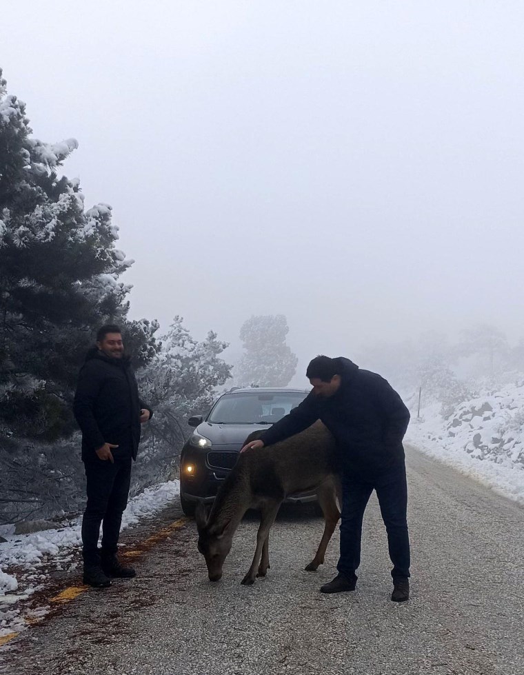 Araçlarıyla kayak merkezine giden bir grup, yolda geyiği fark edip durdu. Gruptakiler geyiğe çeşitli yiyecekler verip, fotoğraf çekti.