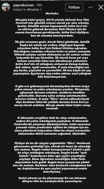 Sosyal medya hesabından paylaşım yapan tasarımcı Yaprak Civan, 2018 yılında yönetmen Selim Evci’nin kendisine fiziksel tacizde bulunduğunu açıkladı.