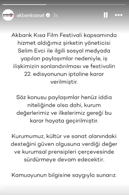 “Akbank Kısa Film Festivali kapsamında hizmet aldığımız şirketin yöneticisi Selim Evci ile ilgili sosyal medyada yapılan paylaşımlar nedeniyle, ilişkimizin sonlandırılması ve festivalin 22. edisyonunun iptaline karar verilmiştir.