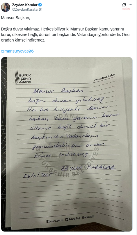 Tutuklu Adana Büyükşehir Belediye Başkanı Zeydan Karalar’ın sosyal medya hesabından, hakkında soruşturma izni verilen Ankara Büyükşehir Belediye (ABB) Başkanı Mansur Yavaş’a ilettiği not paylaşıldı.