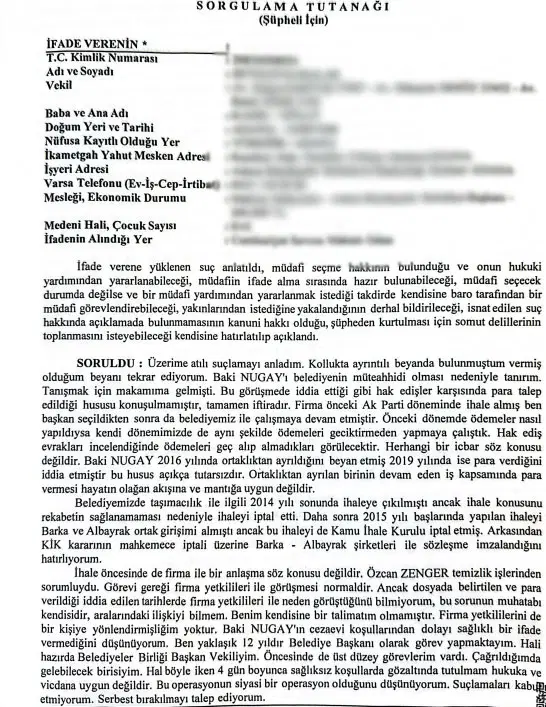İhale öncesinde de firma ile bir anlaşma söz konusu değildir. Özcan Zenger temizlik işlerinden sorumluydu. Görevi gereği firma yetkilileri ile görüşmesi normaldir. Ancak dosyada belirtilen ve para verildiği iddia edilen tarihlerde firma yetkilileri ile neden görüştüğünü bilmiyorum, bu sorunun muhatabı kendisidir, aralarındaki ilişkiyi bilmem, benim kendisine bir talimatım olmamıştır. Firma yetkililerini de bir kişiye yönlendirmişliğim yoktur. Baki Nugay’ın cezaevi koşullarından dolayı sağlıklı bir ifade vermediğini düşünüyorum. Ben yaklaşık 12 yıldır Belediye Başkanı olarak görev yapmaktayım. Hali hazırda Belediyeler Birliği Başkan Vekiliyim. Öncesinde de üst düzey görevlerim vardı. Çağrıldığımda gelebilecek birisiyim. Hal böyle iken 4 gün boyunca sağlıksız koşullarda gözaltında tutulmam hukuka ve vicdana uygun değildir. Bu operasyonun siyasi bir operasyon olduğunu düşünüyorum. Suçlamaları kabul etmiyorum. Serbest bırakılmayı talep ediyorum.”