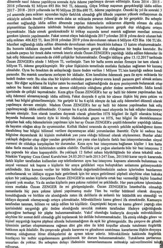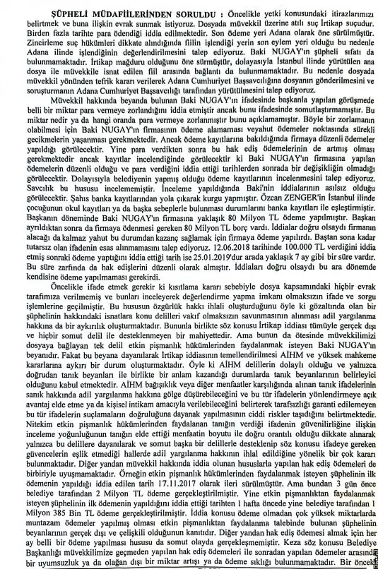 Müvekkil hakkında beyanda bulunan Baki Nugay’ın ifadesinde başkanla yapılan görüşmede belli bir miktar para vermeye zorlandığını iddia etmiştir ancak bunu ifadesinde somutlaştırmamıştır. Bu miktar nedir ya da hangi oranda para vermeye zorlanmıştır bunu açıklamamıştır. Böyle bir zorlamanın olabilmesi için Baki Nugayın firmasının ödeme alamaması veyahut ödemeler noktasında sürekli gecikmelerin yaşanması gerekmektedir. Ancak ödeme kayıtlarına bakıldığında firmaya düzenli ödemeler yapıldığı görülecektir. Yine para verdikten sonra bu hak ediş ödemelerinin de artmış olması gerekmektedir ancak kayıtlar incelendiğinde görülecektir ki Baki Nugay’ın firmasına yapılan ödemelerin düzenli olduğu ve para verdiğini iddia ettiği tarihlerden sonrada bir değişikliğin olmadığı görülecektir. Dolayısıyla belediyenin yapmış olduğu ödeme kayıtlarının incelenmesini talep ediyoruz. Savcılık bu hususu incelememiştir. İnceleme yapıldığında iddialarının asılsız olduğu görülecektir. Şahıs banka kayıtlarından yola çıkarak kurgu yapmıştır. Özcan Zenger’in İstanbul ilinde çocuğunun okul kayıtları ya da başka sebeplerle bulunması durumlarını banka kayıtları ile eşleştirmiştir. Başkanın döneminde Baki Nugay’ın firmasına yaklaşık 80 Milyon TL ödeme yapılmıştır. Başkan ayrıldıktan sonra da firmaya ödenmesi gereken 80 Milyon TL borç vardı. İddialar doğru olsaydı firmanın alacağı da kalmaz yahut bu durumdan kazanç sağlamak için firmaya ödeme yapılırdı. Baştan sona kadar tutarsız olan ifadenin esas alınmamasını talep ediyoruz. 12.06.2018 tarihinde 100.000 TL verdiğini iddia etmiş sonraki ödeme yaptığını iddia ettiği tarih ise 25.01.2019’dur arada yaklaşık 7 ay gibi bir süre vardır. Bu süre zarfında da hak edişlerini düzenli olarak almıştır. İddiaları doğru olsaydı bu ara dönemde kendisine ödeme yapılmaması gerekirdi.”