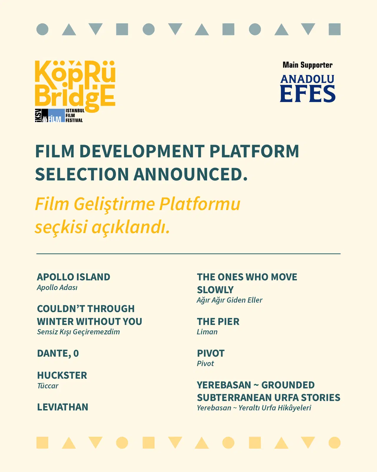 İKSV tarafından düzenlenen ve Anadolu Efes’in ana destekçisi olduğu Film Geliştirme Platformu’na bu yıl başvuran 103 proje, Köprüde Buluşmalar seçici kurulunda yer alan yapımcı Aslı Filiz, yapımcı ve satış temsilcisi Denis Krupnov, yapımcı Melanie Blocksdorf ile festival yönetmeni Tsveta Dobreva tarafından değerlendirildi ve dokuz proje platforma seçildi.