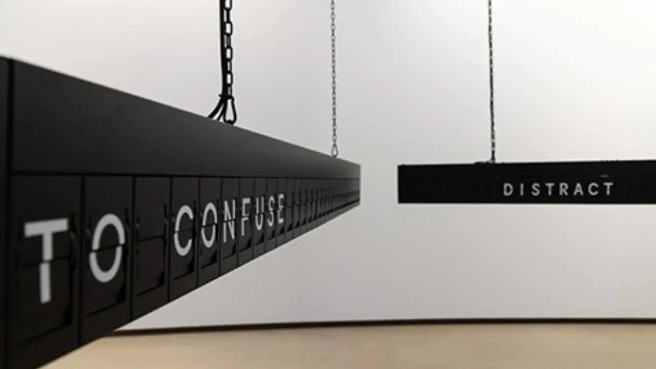 Bir diğer önemli eser de Shilpa Gupta’nın “YineDeBilemezlerRüyalarımı” adlı yerleştirmesi. Üzerinde parçalanmış sözcüklerin yer aldığı ve karşılıklı yerleştirilmiş iki hareketli panelden oluşan eser bu. İlk bakışta iki kişi arasındaki bir diyaloğa şahitlik ettiğimizi düşünsek de aslında birden fazla kişinin arasında geçen konuşma mı yoksa yok olmuş bir usun kendi kendisine konuşması mı, ayırt etmesi zor bir hale dönüşüyor… Eserin dikkat çekici yanı ise sözcüklerin birçoğunun harflerinin eksik ya da hatalı olması. Sansürlenmiş bir metnin, kendini var etme çabası… Bu, baskı ve korkunun giderek belirleyici hale geldiği günümüzde, hem Türkiye’de hem de dünyada muhalif seslerin kendilerine yer açma çabalarına işaret ediyor.