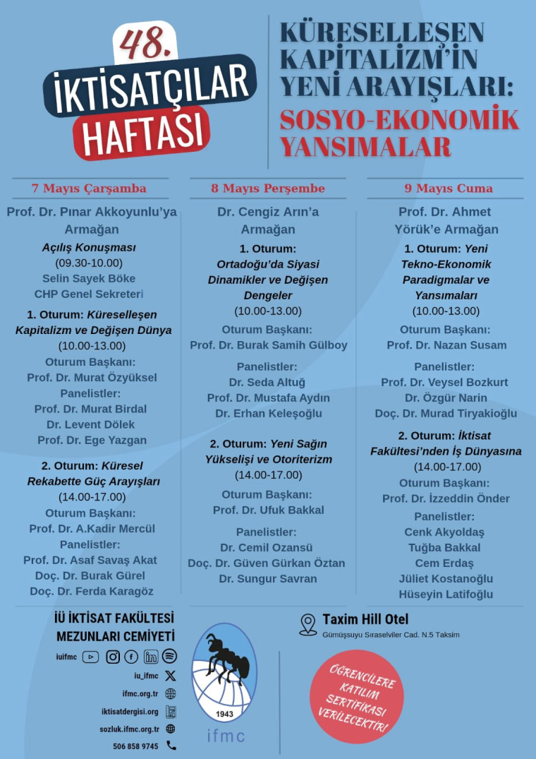 İÜ İktisat Fakültesi Mezunları Cemiyeti’nin (İFMC), bu yıl 48.sini düzenleyeceği “İktisatçılar Haftası”, 7-8-9 Mayıs 2025 tarihlerinde “Küreselleşen Kapitalizm’in Yeni Arayışları: Sosyo-Ekonomik Yansımalar” ana başlığı altında Taksim Sıraselviler caddesindeki Taxim Hill Otel’de 10.00-17.00 saatleri arasında kamuya açık olarak gerçekleşiyor.