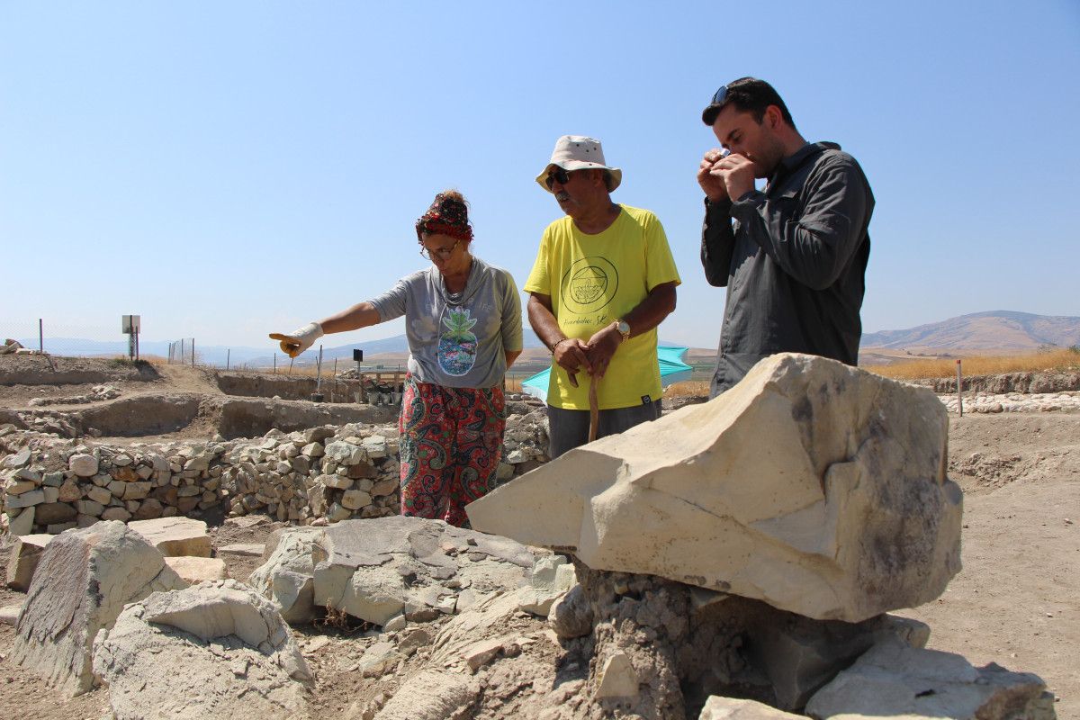 Tarihi tapınağın inşasında kullanılan açık yeşil renge sahip ve ince taneli tüf olarak isimlendirilen volkanik kaya parçalarının benzerinin kazı alanına 10 kilometre mesafede yer alan Doğantepe köyünde antik taş ocağında bulunduğunu ifade eden Prof. Dr. Dönmez, “Arkeometri çalışmamızın ilk sonucunu taş analizlerinden aldık.