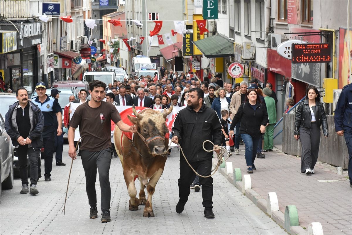 Kortejin önünde Türk bayrağıyla süslenen 750 kiloluk boğa da yer aldı.