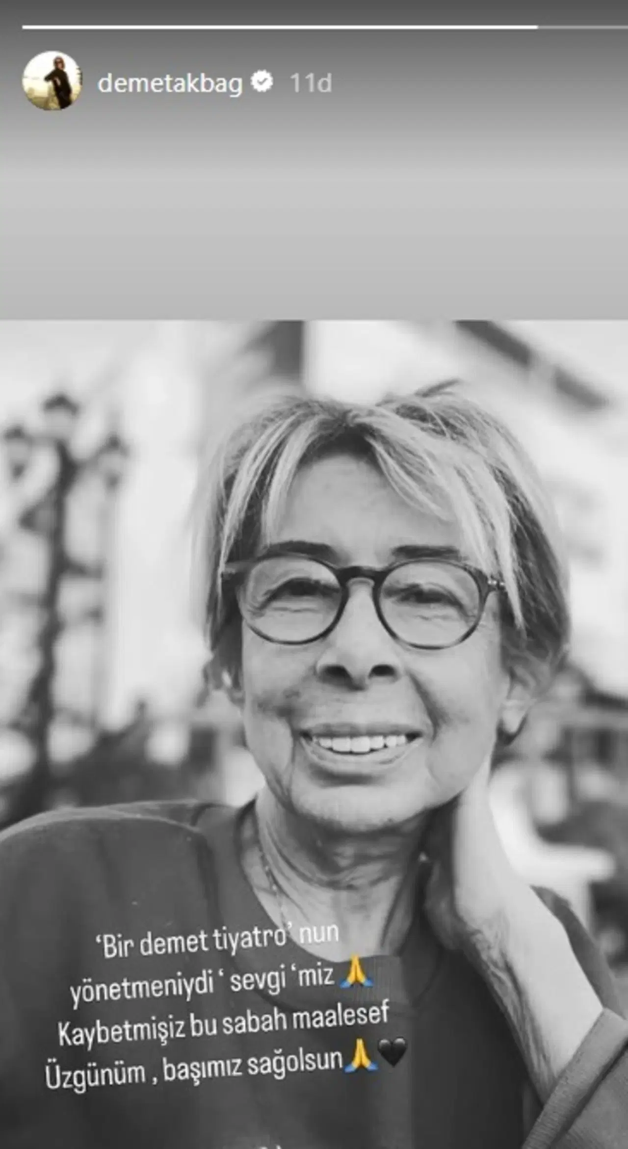 Acı haberin ardından “Bir Demet Tiyatro” oyuncularından Demet Akbağ da sosyal medya hesabından yaptığı paylaşımla üzüntüsünü dile getirdi.