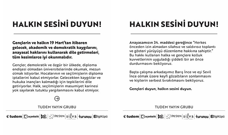 “Gençlerin ve halkın 19 Mart’tan itibaren gelecekle ilgili akademik ve demokratik kaygılarını, anayasal haklarını kullanarak dile getirmeleri, tüm kesimlerce iyi okunmalıdır. Gençler, demokratik ve özgür bir ülkede, diploma endişesi olmadan üniversitelerinde okumak ve mezun olmak istiyorlar. Hocalarının ve seçilmişlerin diploma iptallerini kabul etmiyorlar. Gelecekten kaygılılar ve hukuka inançları kalmadığı için tepkilerini dile getiriyorlar. Halk, seçilmişlerin masumiyet karinesi yok sayılarak tutuklu yargılanmasını kabul etmiyor” denildi.