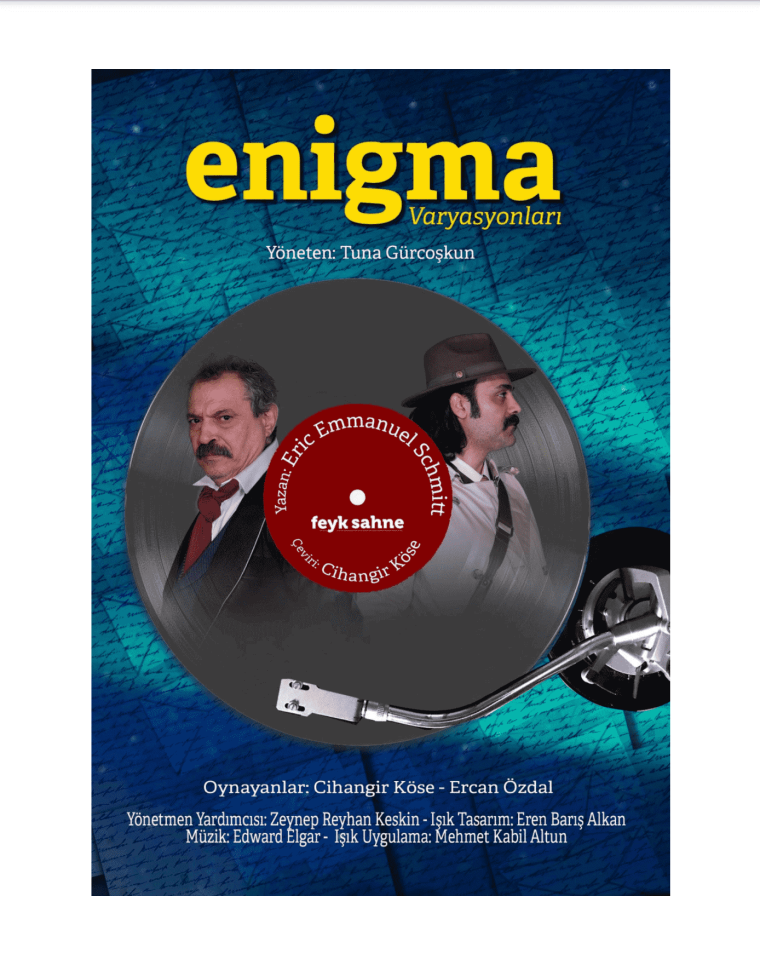 Eric Emmanuel Schmitt’in yazdığı ve Cihangir Köse’nin çevirdiği “Enigma Varyasyonları” adlı tiyatro oyunu, 20 Şubat 2025 Perşembe günü Feyk Sahne’de prömiyer yapmaya hazırlanıyor. Yönetmenliğini Tuna Gürcoşkun’un üstlendiği oyunda, Cihangir Köse ve Ercan Özdal başrolleri paylaşıyor.