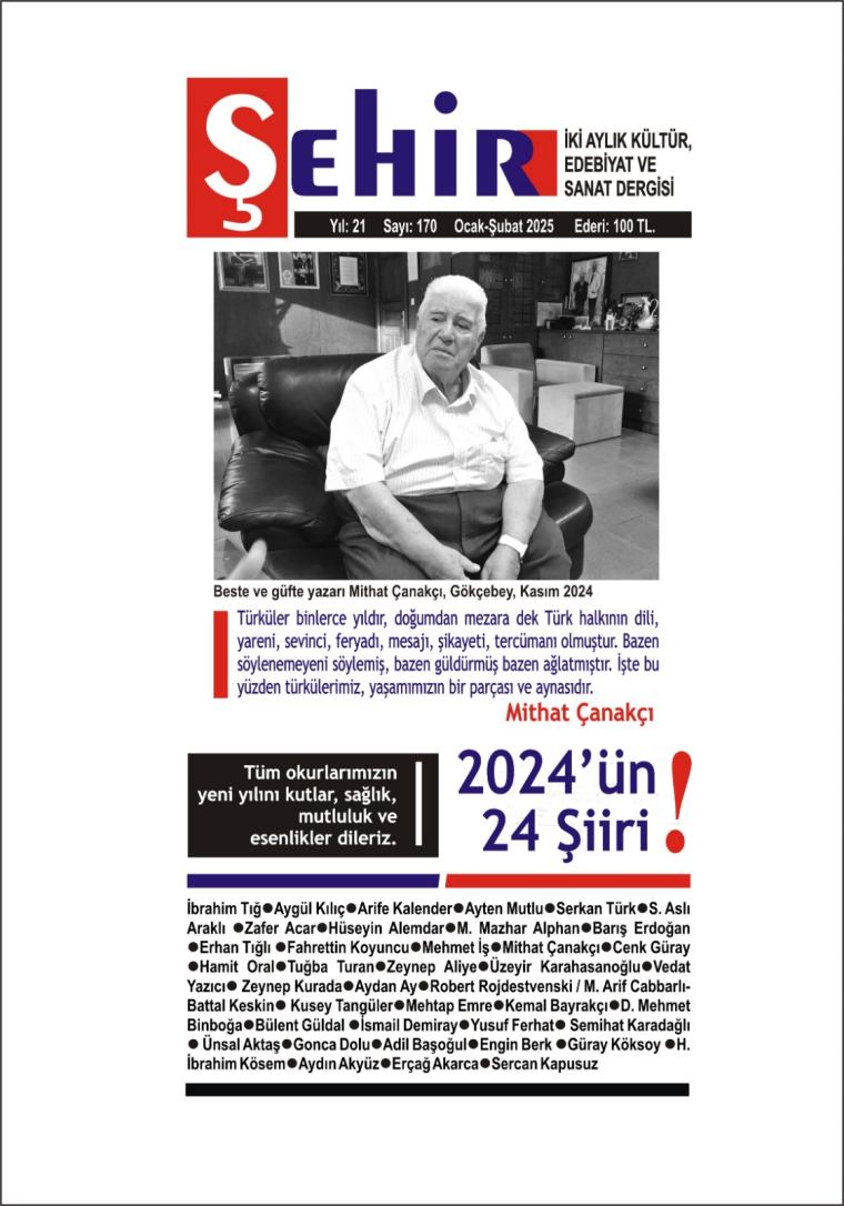 Şehir’in bu sayısında İbrahim Tığ, “2024 yılının 24 Şiiri”ni ve beğendiği şiirleri bir değerlendirme yazısıyla sunarken seçtiği 2004 Yılında yayınlanan beş şiire yer veriliyor. Dergide; İbrahim Tığ, Hüseyin Alemdar, Barış Erdoğan, Erhan Tığlı, Tuğba Turan, Zeynep Aliye, Aydan Ay, Üzeyir Karahasanoğlu, D. Mehmet Binboğa, Engin Berk, İsmail Demiray yazı ve öyküleriyle yer alıyor. Derginin şairleri ise şunlar: