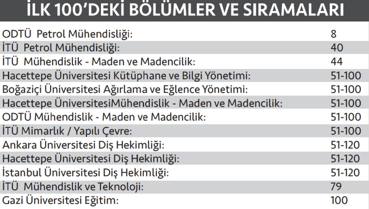 – 13 alan dünya genelinde ilk 100’de. Diş hekimliği, petrol hühendisliği, kütüphane ve bilgi yönetimi gibi alanlar öne çıkıyor.