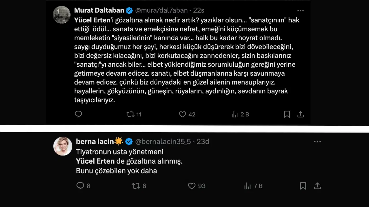 Müzisyen Çiğdem Erken, X hesabından “Yücel Erten’in (yaş 80) ilaçları dahi olmadan dün sabah 05.30 dan itibaren muhtemelen bir sandalye tepesinde gözaltında tutulması kabul edilemez. Sadece Türkiye’nin değil dünya tiyatrosunun önemli ismi olan ustamızın bir an önce serbest bırakılması için sesinizi yükseltin.” paylaşımını yaptı.