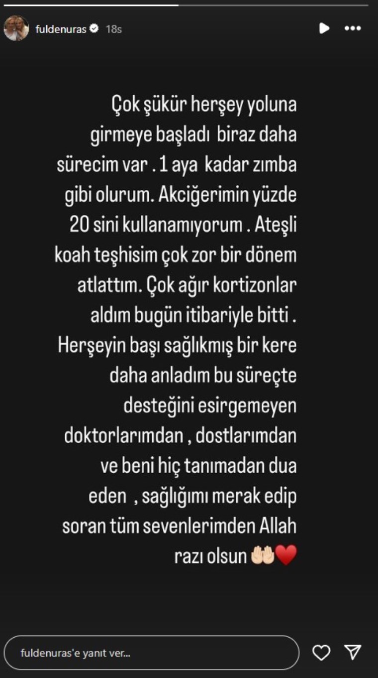 “Çok şükür her şey yoluna girmeye başladı. Biraz daha sürecim var. Bir aya kadar zımba gibi olurum. Akciğerimin yüzde 20’sini kullanamıyorum. Ateşli KOAH teşhisi konuldu. Çok zor bir dönem atlattım. Çok ağır kortizonlar aldım, bugün itibariyle bitti. Her şeyin başı sağlıkmış, bir kere daha anladım.”