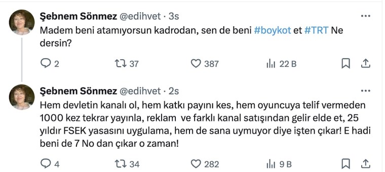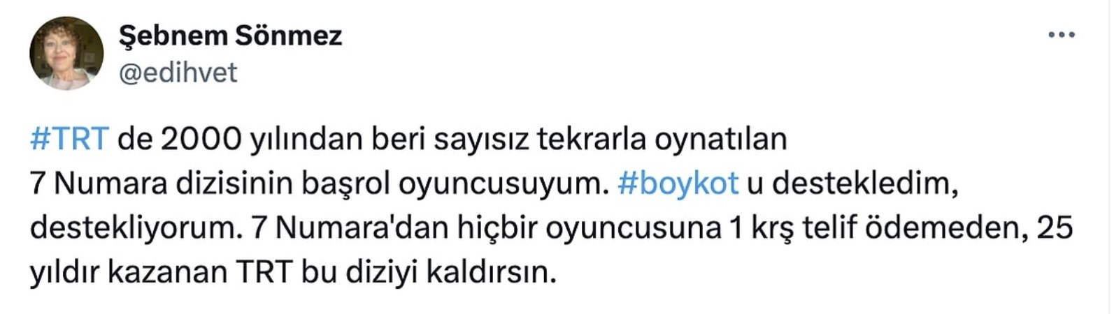 Bu gelişmelerin ardından, bir döneme damga vuran efsane dizi “7 Numara”nın başrol oyuncularından Şebnem Sönmez, sosyal medya hesabından dikkat çeken bir paylaşım yaptı. TRT’ye doğrudan seslenen Sönmez, boykotu desteklediğini belirterek, yıllardır tekrarları yayınlanan 7 Numara dizisinin tüm dijital platformlardan kaldırılmasını talep etti.