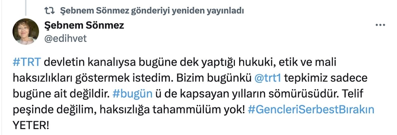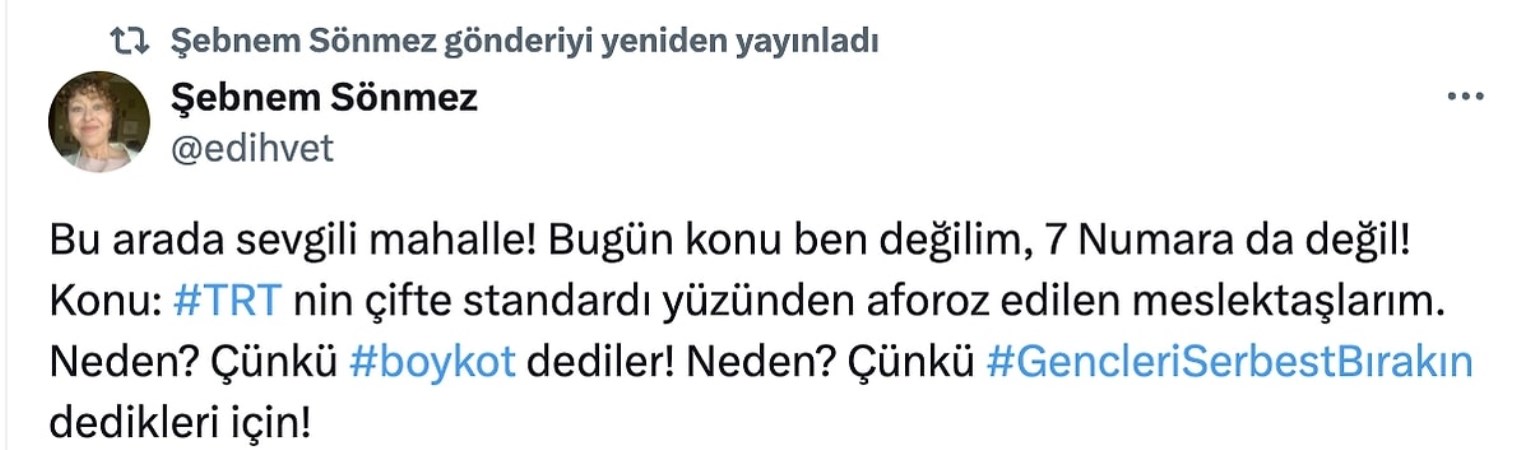 “TRT’ye sesleniyorum. Boykotu destekliyorum. Sayısız kez yayınladığınız 7 Numara’yı platformlarınızdan kaldırın.”