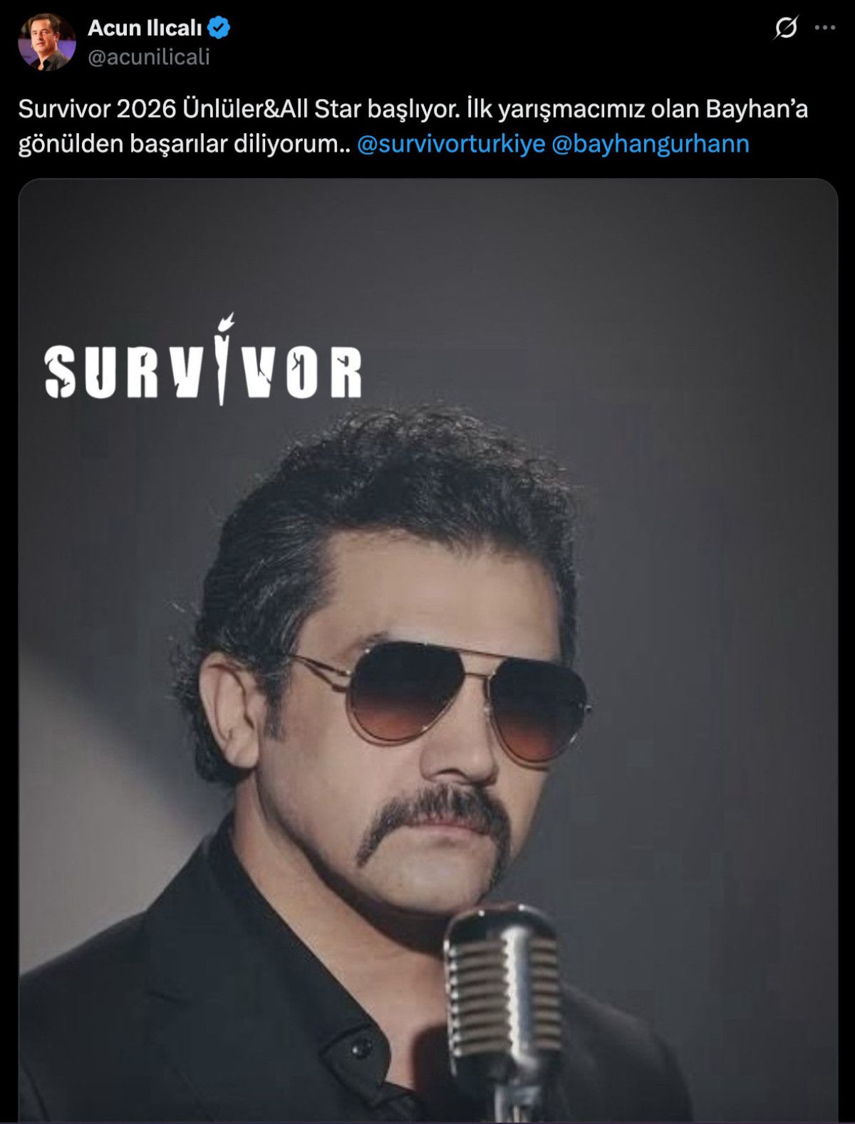 Ilıcalı, heyecanlandıran paylaşımına şu notu düştü: “Survivor 2026 Ünlüler&All Star başlıyor. İlk yarışmacımız olan Bayhan’a gönülden başarılar diliyorum.”