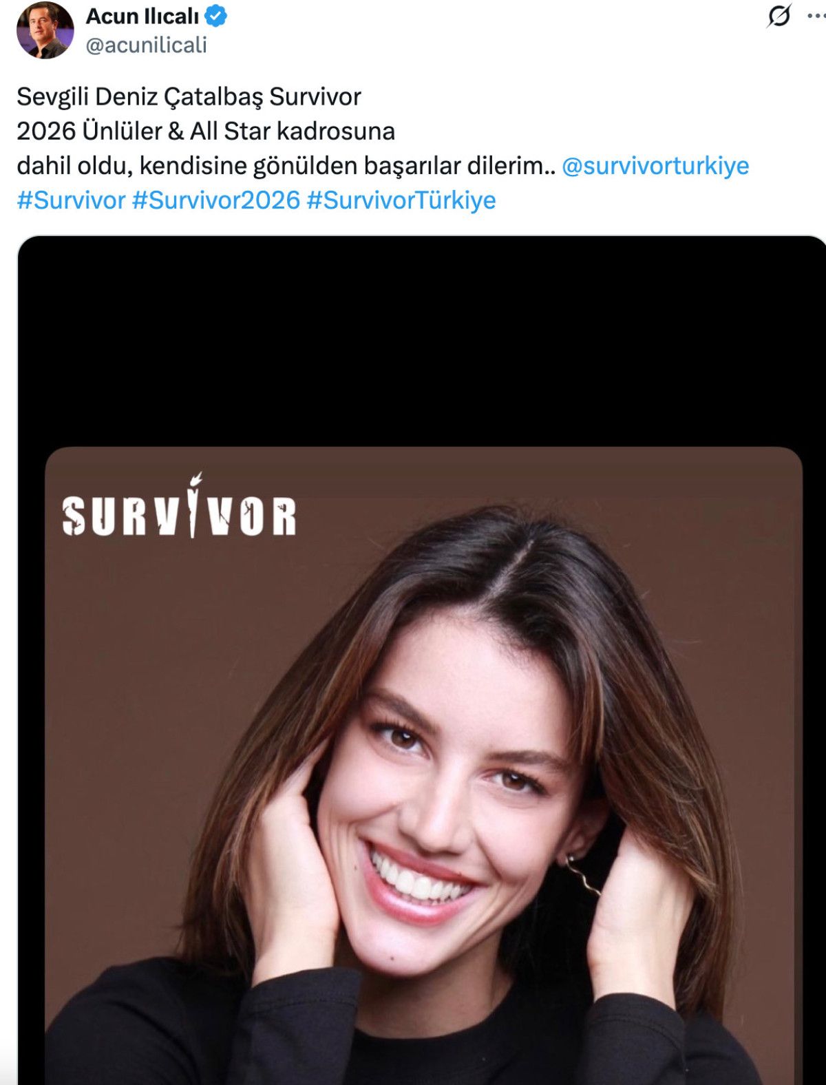 Acun Ilıcalı, Deniz Çatalbaş’ın Survivor’da yarışacağını sosyal medya hesabından “Sevgili Deniz Çatalbaş Survivor 2026 Ünlüler & All Star kadrosuna dahil oldu. Kendisine gönülden başarılar diliyorum” sözleriyle açıkladı.