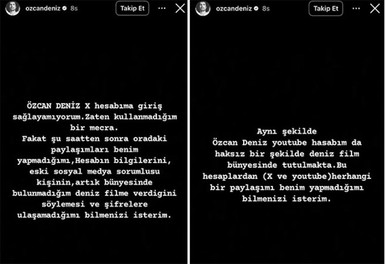 Sanatçı, “Özcan Deniz X hesabıma giriş sağlayamıyorum. Zaten kullanmadığım bir mecra. Ancak oradaki paylaşımları benim yapmadığımı bilmenizi isterim. Hesabın bilgileri, eski sosyal medya sorumlum tarafından, artık bünyesinde bulunmadığım Deniz Film’e verilmiş” dedi.