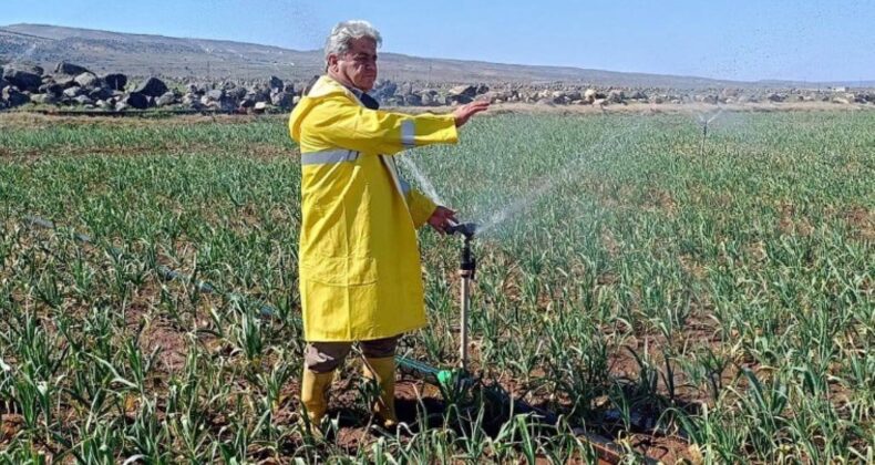 AB Tescilli Araban Sarımsağı üreticileri, Nisan ayında yapılacak olan yeşil firik sarımsak hasadı öncesinde ürün kalitesinin düşmemesi için yağmurlama sulama sistemini devreye soktu.