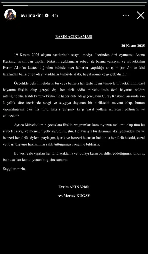 Açıklamada, gündemdeki söylemlerin müvekkilin özel hayatına yönelik bir saldırı niteliği taşıdığı belirtilirken; Evrim Akın ile Asena Keskinci’nin babası Güray Keskinci arasında son üç yıldır sevgi ve saygıya dayalı bir ilişki bulunduğu, bu birlikteliği yıpratmaya yönelik her türlü girişime karşı yasal sürecin işletildiği vurgulandı.
