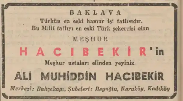 Ali Muhiddin Hacı Bekir’in 1940 tarihli reklamında “Baklava Türk’ün en eski hamur işi tatlısıdır” yazıyor. Ancak tarihçi Burak Onaran, 1930’lara kadar Türk ve baklava kelimesini belgelerde yanyana görmediğini söylüyor.