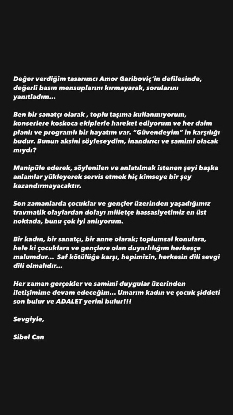 Sibel Can, sözlerine “Değer verdiğim tasarımcı Amor Gariboviç’in defilesinde, değerli basın mensuplarını kırmayarak sorularını yanıtladım… Ben bir sanatçı olarak, toplu taşıma kullanıyorum, konserlere koskoca ekiplerle hareket ediyorum ve her daim planlı ve programlı bir hayatım var. ‘Güvendeyim’in karşılığı budur. Bunun aksini söyleseydim, inandırıcı ve samimi olacak mıydı?” diye açıklık getirdi.