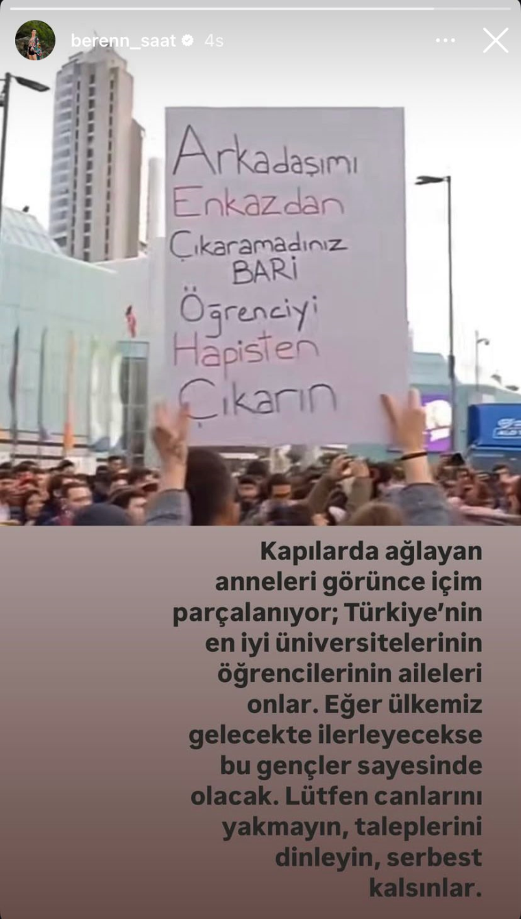 Saat, paylaşımında “Kapılarda ağlayan anneleri gördükçe içim parçalanıyor; Türkiye’nin en iyi üniversitelerinin öğrencilerinin aileleri onlar. Eğer ülkemiz gelecekte ilerleyecekse bu gençler sayesinde olacak. Lütfen canlarını yakmayın, taleplerini dinleyin, serbest kalsınlar” diye konuştu.