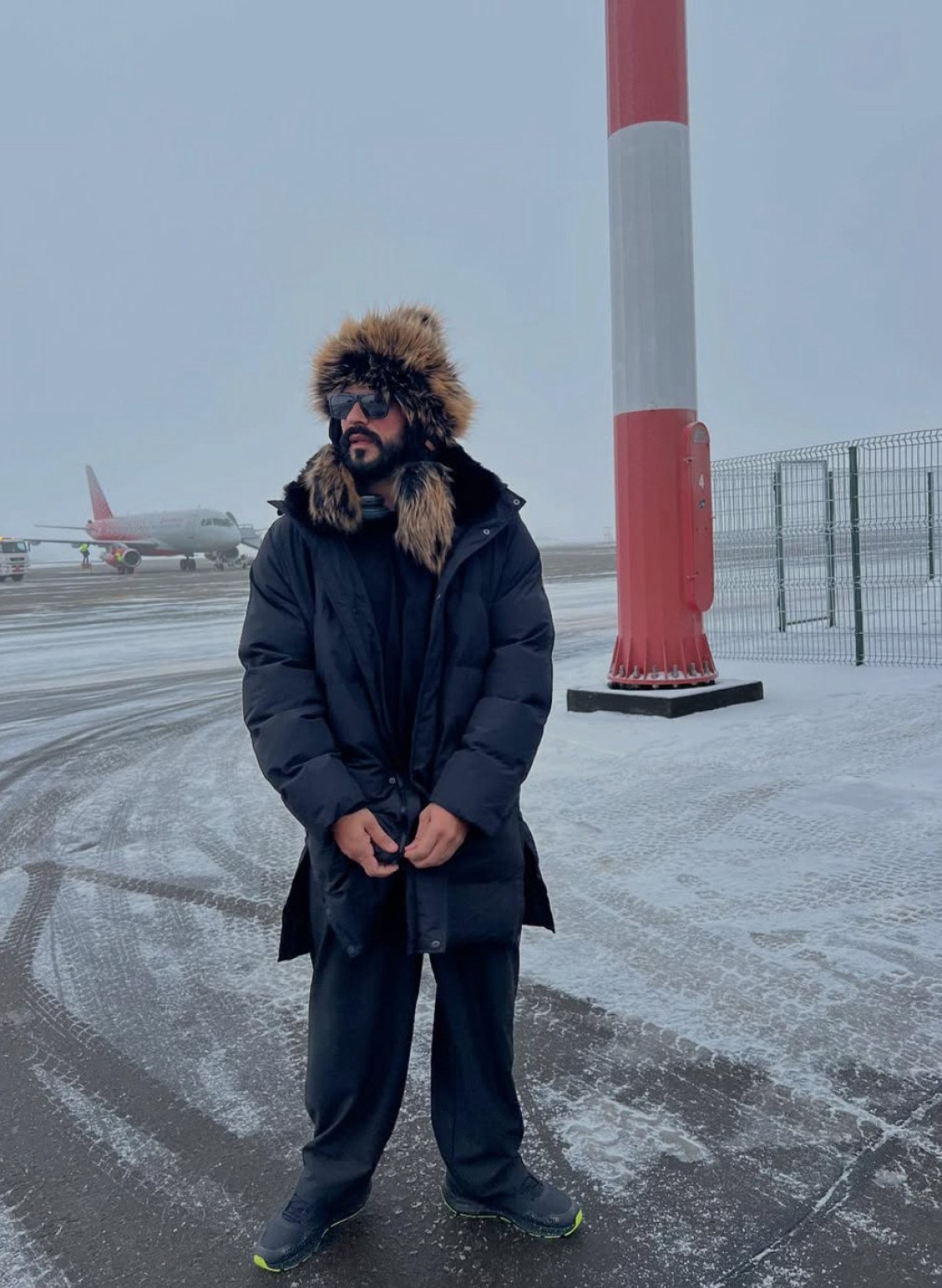 Moskova’ya giden ünlü oyuncu, soğuk havalara karşı kendince önlemler aldı.