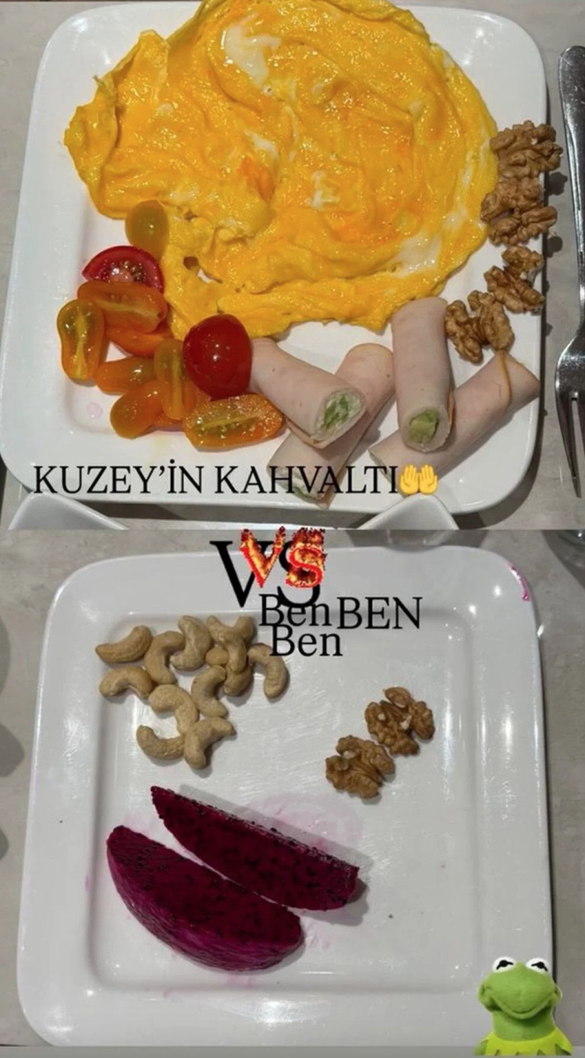 Geceyi şiş karnıyla noktalayan Şıkel, kahvaltı tabağını paylaştı. Oğlu Kuzey ve kendi tabağını yan yana koyarak aradaki farkı gözler önüne serdi.