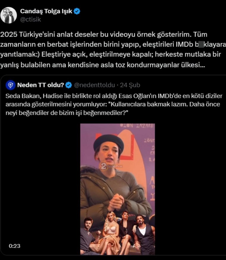 Gazeteci Candaş Tolga Işık ise oyuncunun bu açıklamalarına sert sözlerle yanıt verdi. “2025 Türkiye’sini anlat deseler, bu videoyu örnek gösteririm” diyen Işık, eleştirisini şu sözlerle sürdürdü:
