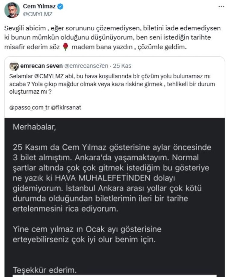 Ankara’dan İstanbul’daki stand-up gösterisine gitmek için bilet alan Emrecan Seven, hava koşullarını riskli bularak biletini erteletmek istedi. Bilet şirketinden olumsuz yanıt alınca Cem Yılmaz’a sosyal medya üzerinden ulaşmayı denedi.