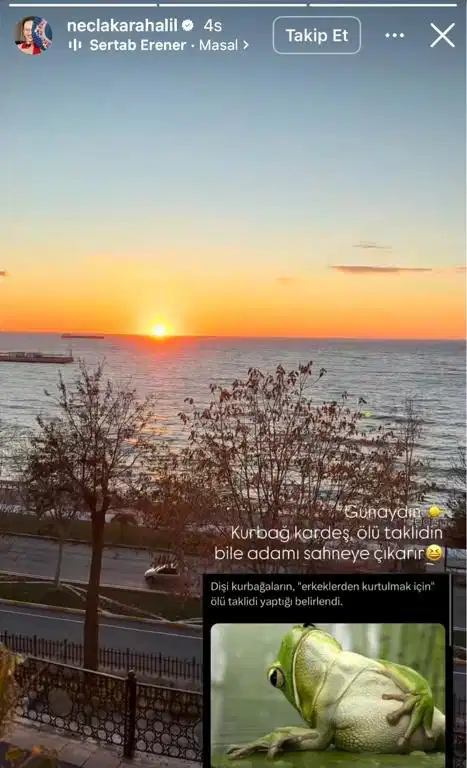 Necla Karahalil, Instagram hikayesinde, “Dişi kurbağaların, ‘erkeklerden kurtulmak için’ ölü taklidi yaptığı belirlendi” ifadesinin yer aldığı bir paylaşıma yer verdi.