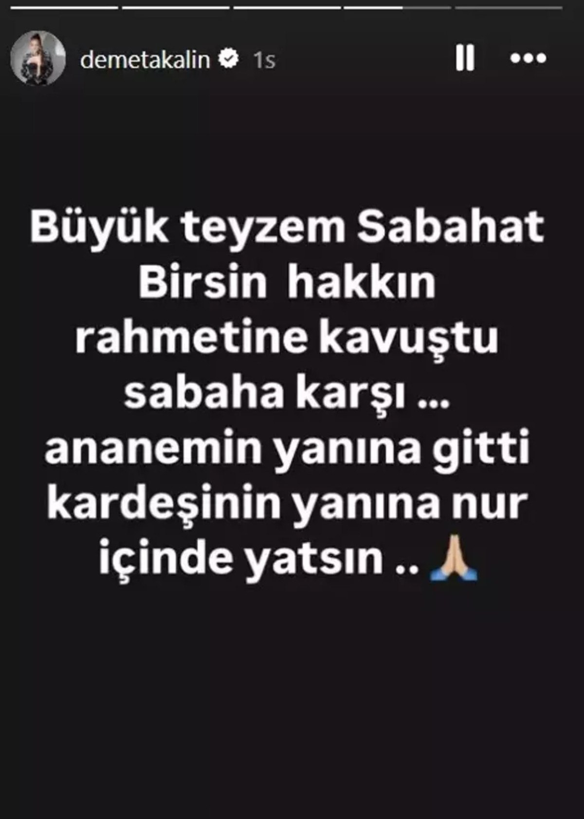 Instagram hesabından açıklama yapan Akalın, teyzesinin öldüğünü açıklayarak “Büyük teyzem Sabahat Birsin hakkın rahmetine kavuştu sabaha karşı… Anneannemin yanına gitti. Kardeşinin yanında nur içinde yatsın” dedi.