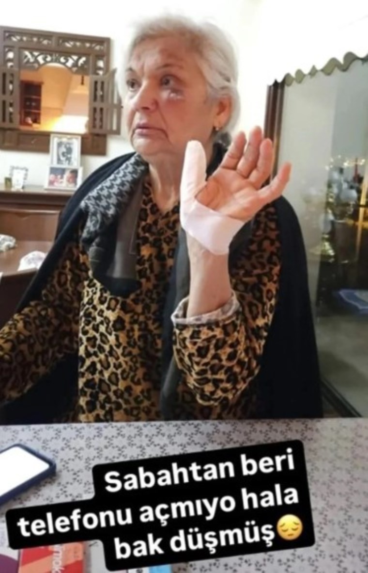 Parmağını inciten ve gözü şişen annesinin fotoğrafını paylaşan Akalın, “Sabahtan beri telefonunu açmıyor hala, bak düşmüş” ifadelerini kullandı.