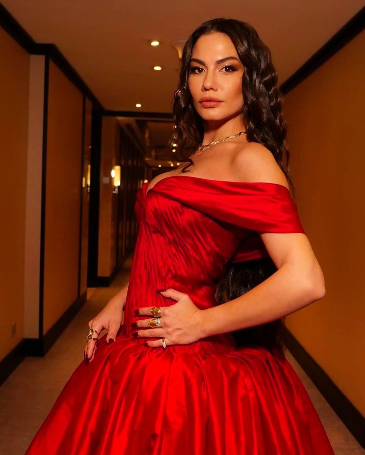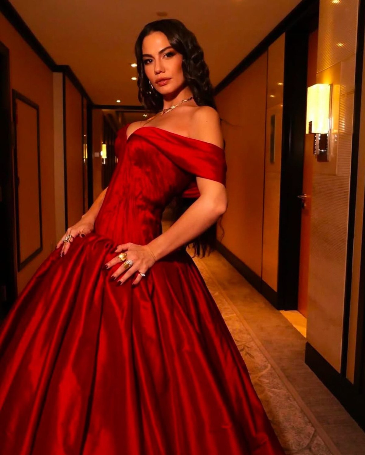 Geceye kırmızı bir gelinliği andıran elbisesiyle katılan Özdemir, dikkatleri yine üzerine çekmeyi başardı.