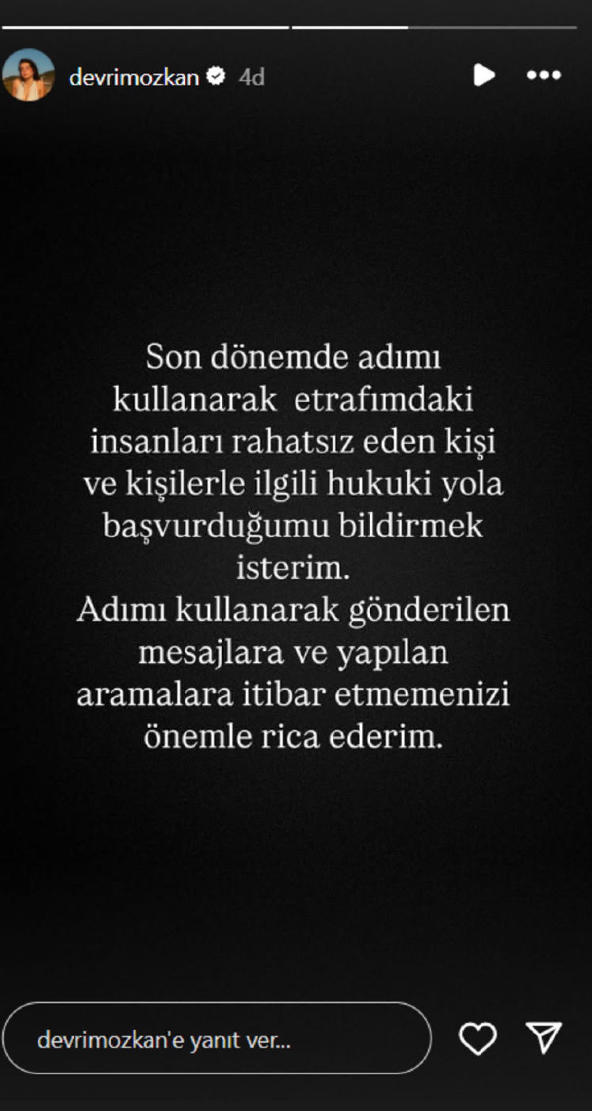Sosyal medya hesabından bir açıklama yapan Özkan, “Son zamanlarda adımı kullanarak çevremdeki insanları rahatsız eden kişi veya kişiler hakkında hukuki süreci başlattığımı bildirmek isterim.