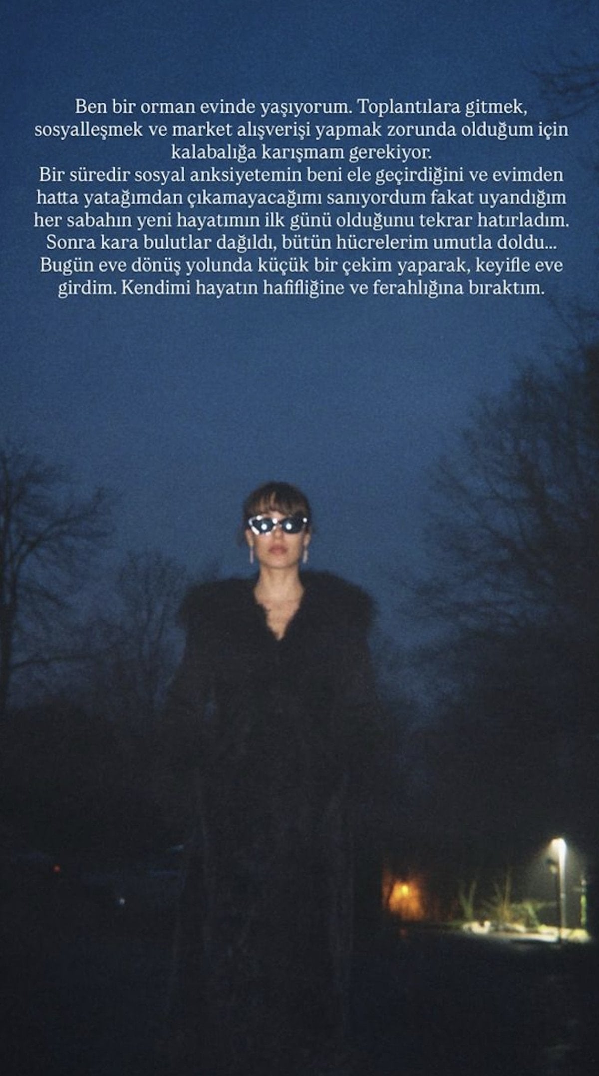 Fakat uyandığım her sabahın, yeni hayatımın ilk günü olduğunu kendime tekrar hatırlattım. Sonra kara bulutlar dağıldı, bütün hücrelerim umutla doldu… Bugün eve dönüş yolunda küçük bir çekim yaparak keyifle eve girdim. Kendimi hayatın hafifliğine ve ferahlığına bıraktım.” ifadelerine yer verdi.