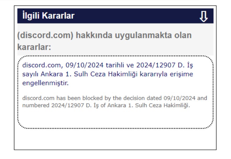 Adaleti Bakanı Yılmaz Tunç, sosyal medya hesabından yaptığı açıklamada, Discord isimli sosyal medya platformunda 5651 Sayılı “İnternet ortamında yapılan yayınların düzenlenmesi ve bu yayınlar yoluyla işlenen suçlarla mücadele edilmesi” hakkında kanunun 8/1 maddesinde yer alan “çocukların cinsel istismarı ve müstehcenlik” suçlarının işlendiğine dair yeterli şüphenin bulunduğunu açıkladı. Tunç, söz konusu sosyal medya uygulamasının tüm yayınlarının içerikten çıkartılarak belirtilen URL adreslerine Türkiye’den erişimin engellenmesi kararı verildiğini kaydetti.