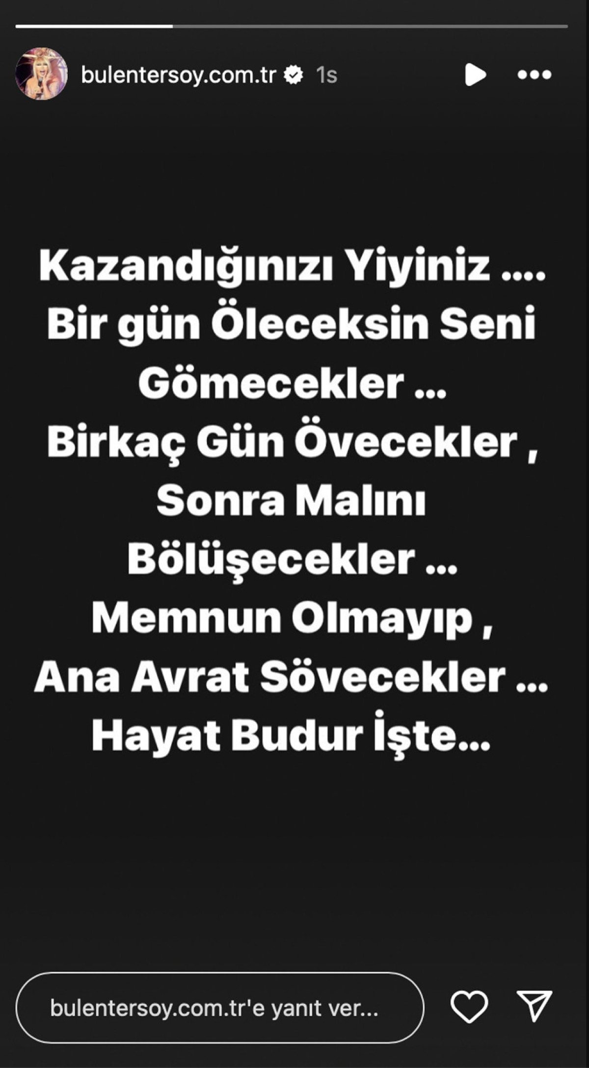 Takipçilerini uyaran ve vefatı hatırlatan Diva, şunları yazdı: “Kazandığınızı yiyiniz. Bir gün öleceksin seni gömecekler. Birkaç gün övecekler, sonra malını bölüşecekler. Şad olmayıp ana avrat sövecekler. Hayat budru işte.”