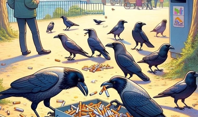 SİGARA İZMARİTİ TOPLAYAN KARGALAR