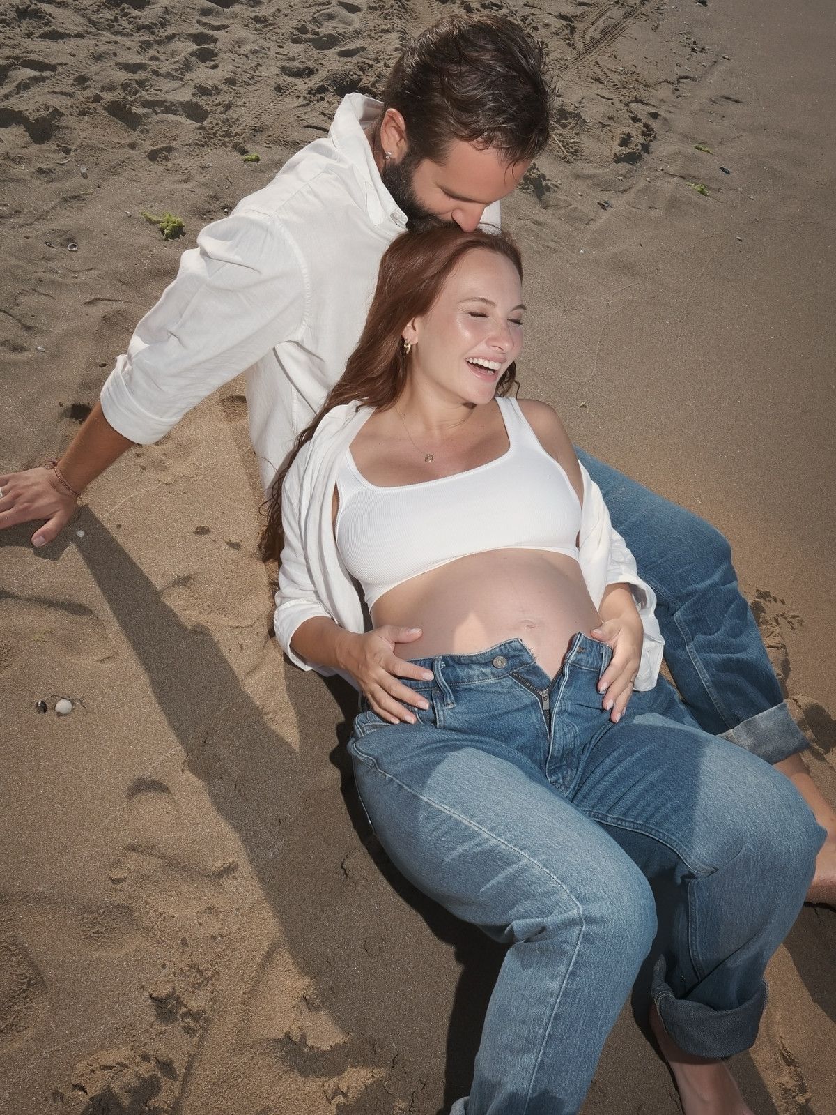 Eşi Çağrı Çıtanak ile kumsalda kot pantolon ve beyaz gömlek temalı pozlar veren güzel oyuncu sosyal medya hesabından yayınladı.