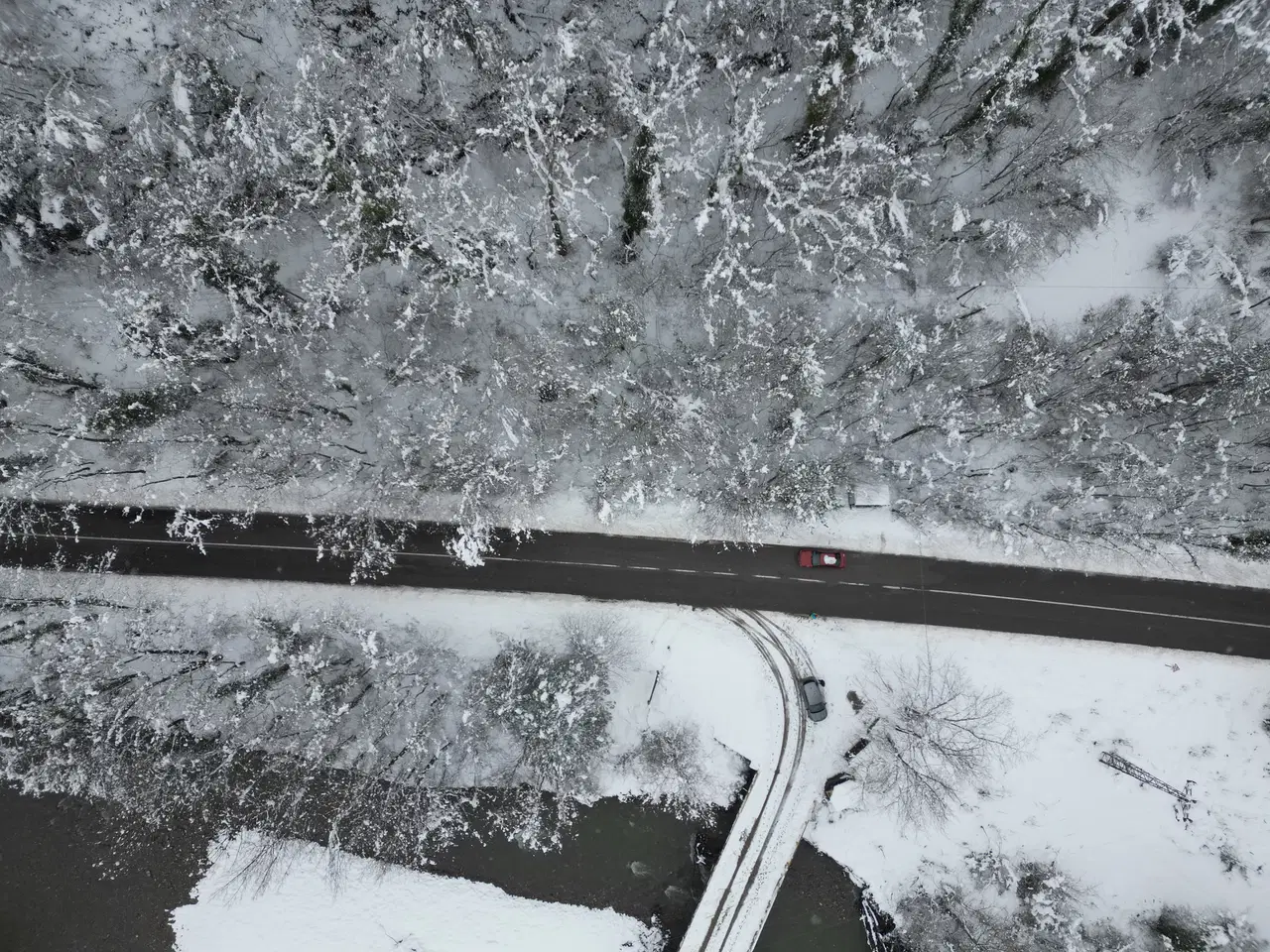 Bartın ile Karabük arasında iki tarafı ağaçlarla kaplı olan ve ‘Ağaç tünel yol’ olarak bilinen kara yolunda, kar yağışıyla birlikte ortaya çıkan manzara, dron ile görüntülendi.