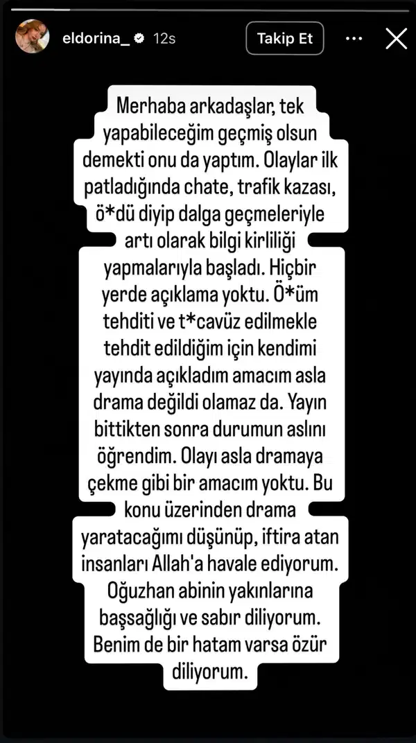 Daha sonra sosyal medya hesabından da açıklama yapan genç yayıncı, ölüm ve cinsel saldırı tehdidi aldığını belirtti. Yaşadığı baskıyı paylaşan Eldorina, sessiz kalanlara da sitem etti.