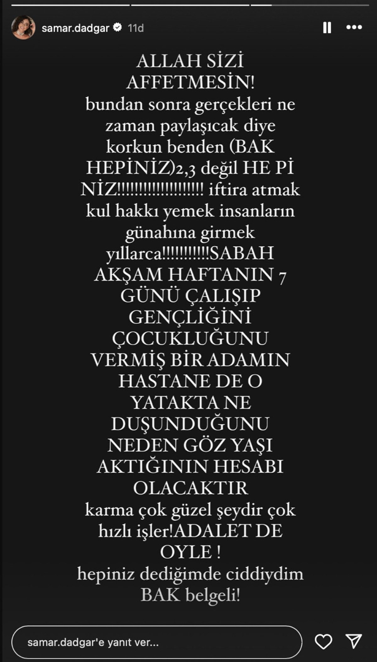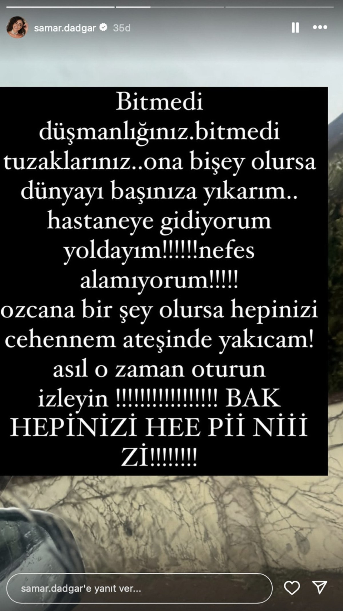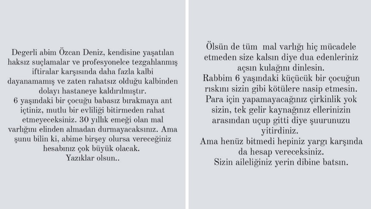 Semerci, Özcan Deniz’in kalp rahatsızlığı sebebiyle hastaneye kaldırıldığını açıkladı ve tıpkı Samar Dadgar gibi kendisine bunu yaşatan aile bireylerine seslendi.