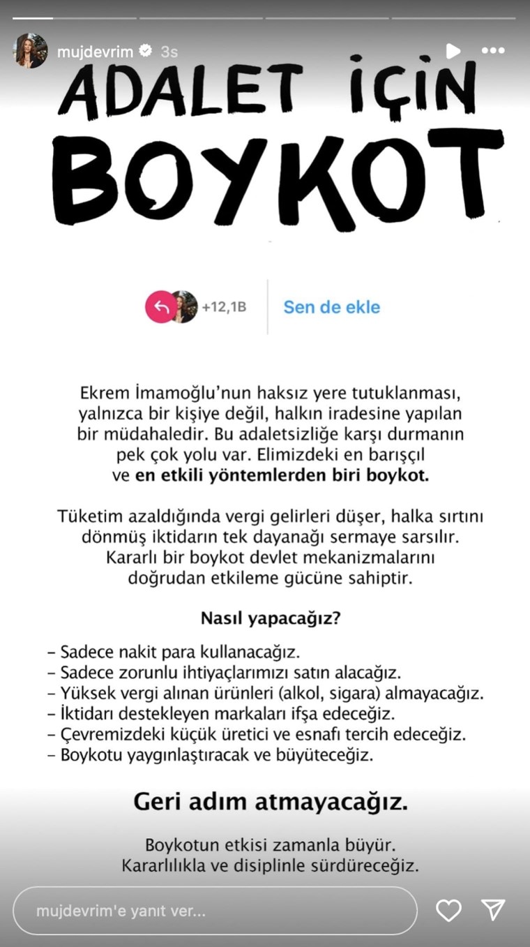 “Ekrem İmamoğlu’nun haksız yere tutuklanması, yalnızca bir kişiye değil, halkın iradesine yapılan bir müdahaledir. Bu adaletsizliğe karşı durmanın pek çok yolu var. Elimizdeki en barışçıl ve en etkili yöntemlerden biri boykot. Tüketim azaldığında vergiler düşer, halka sırtını dönmüş iktidarın tek dayanağı sermaye sarsılır. Kararlı bir boykot, devlet mekanizmalarını doğrudan etkileme gücüne sahiptir. Geri adım atmayacağız. Boykotun etkisi zamanla büyür. Kararlılık ve disiplinle sürdüreceğiz.”