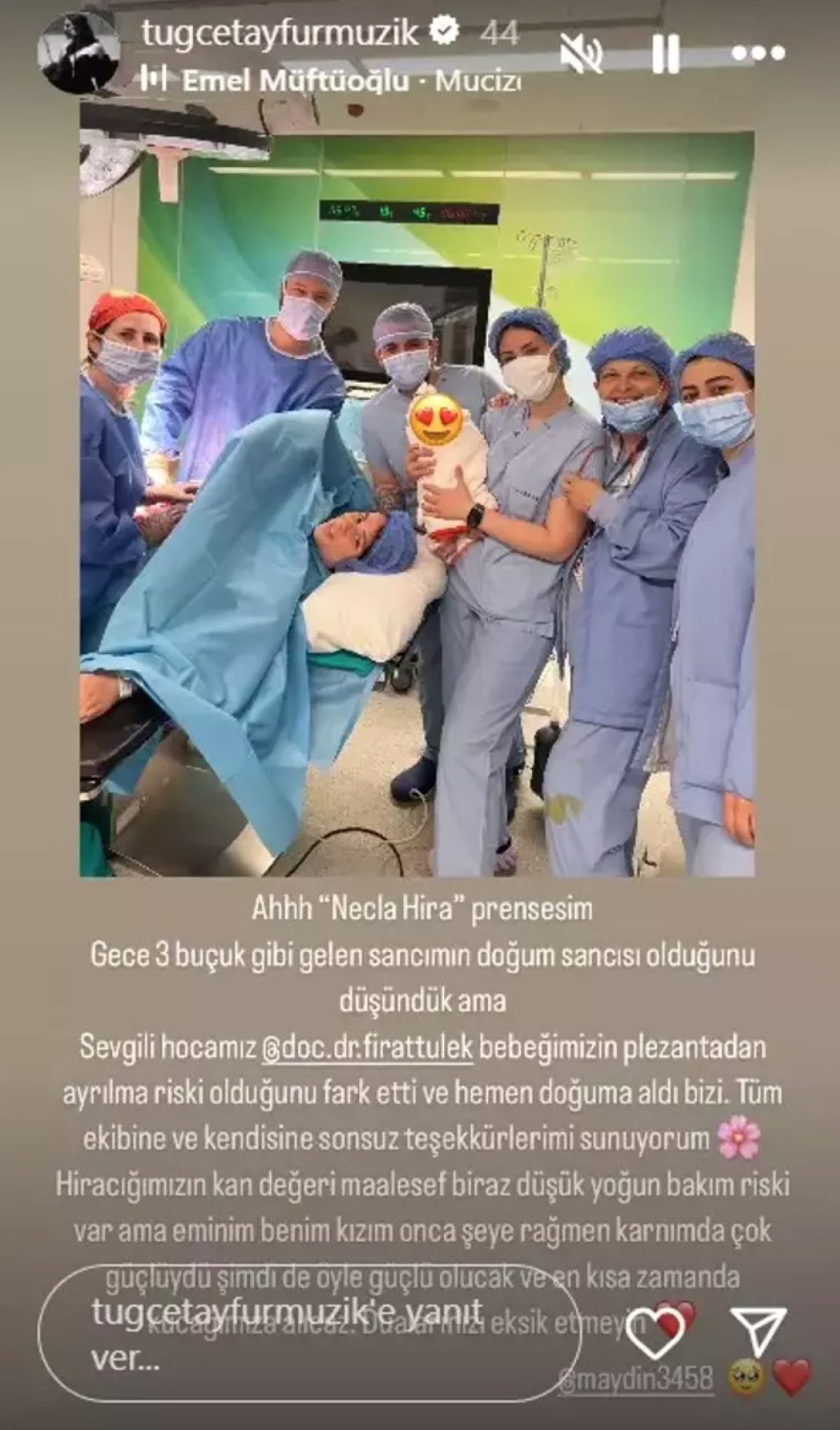 “Ah ‘Necla Hira’ prensesim. Gece 03.30 gibi gelen sancımın doğum sancısı olduğunu düşündük ama sevgili hocamız bebeğimiz plasentadan ayrılma riski olduğunu fark etti ve hemen doğuma aldı bizi. Tüm ekibine ve kendisine sonsuz teşekkürlerimi sunuyorum. Hiracığımızın kan değeri maalesef biraz düşük, yoğun bakım riski var ama eminim benim kızım onca şeye rağmen karnımda çok güçlüydü şimdi de öyle güçlü olacak. En kısa zamanda kucağımıza alacağız. Dualarınızı eksik etmeyin.”