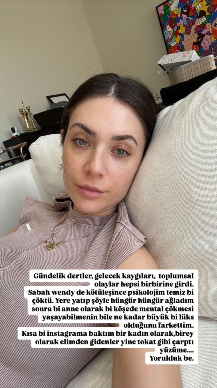 “Gündelik dertler, gelecek kaygıları, toplumsal olaylar hepsi birbirine girdi. Sabah köpeğim Wendy’nin kötüleşmesiyle psikolojim tamamen çöktü. Yere yatıp hüngür hüngür ağladım. Sonra, bir anne olarak bir köşede mental çöküş yaşayabilmenin bile ne kadar büyük bir lüks olduğunu fark ettim.”