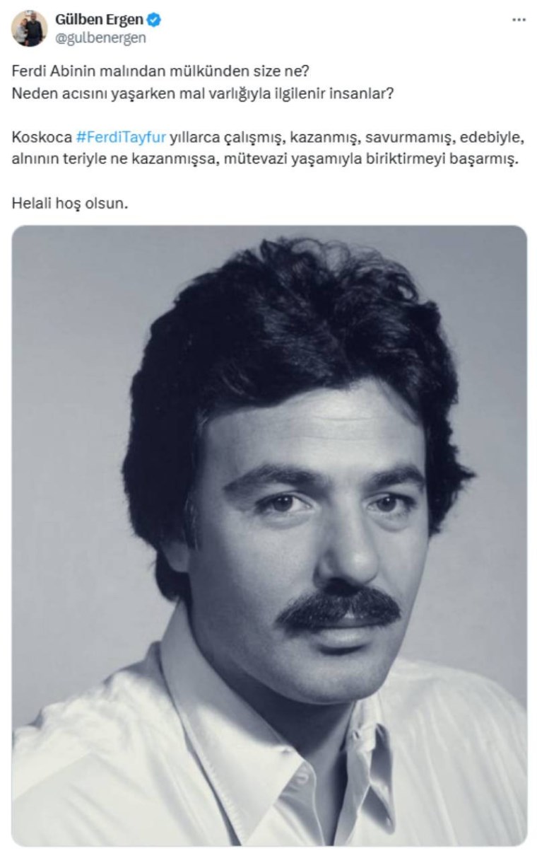 X hesabında meslektaşının nostaljik bir fotoğrafına yer veren şarkıcı, “Ferdi ağabeyin malından mülkünden size ne? Neden acısını yaşarken mal varlığıyla ilgilenir insanlar? Koskoca Ferdi Tayfur yıllarca çalışmış, kazanmış, savurmamış, edebiyle, alnının teriyle ne kazanmışsa, mütevazi yaşamıyla biriktirmeyi başarmış. Helali hoş olsun” ifadelerini kullandı.
